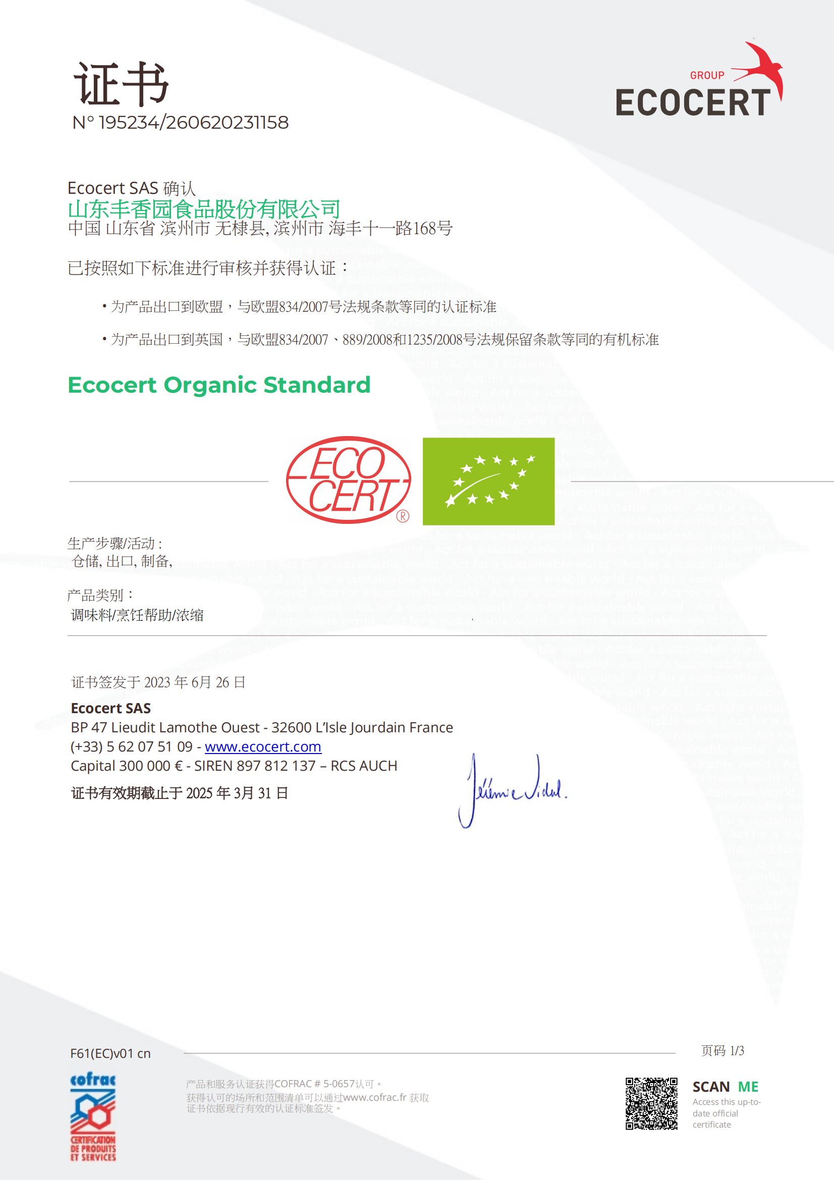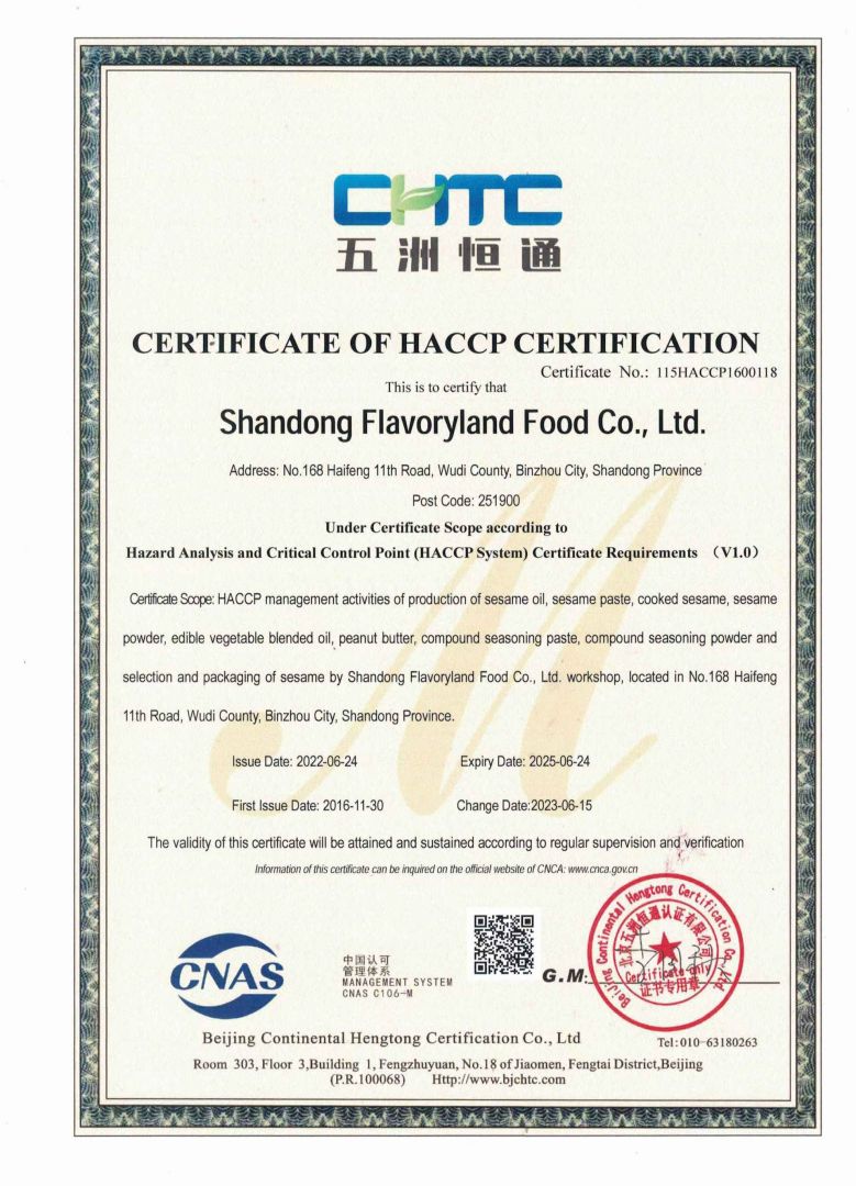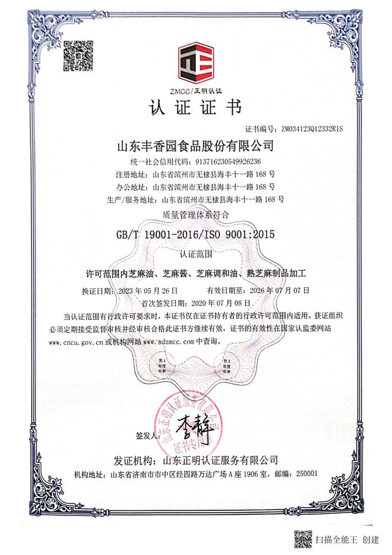 ? ? 豐香園小磨香油、芝麻調(diào)和油、花生醬、芝麻醬、混合醬、熟芝麻制品均已通過英國零售商協(xié)會BRC認證、歐盟 美國和國內(nèi)有機、HACCP體系認證,是山東省出口食品備案企業(yè)。